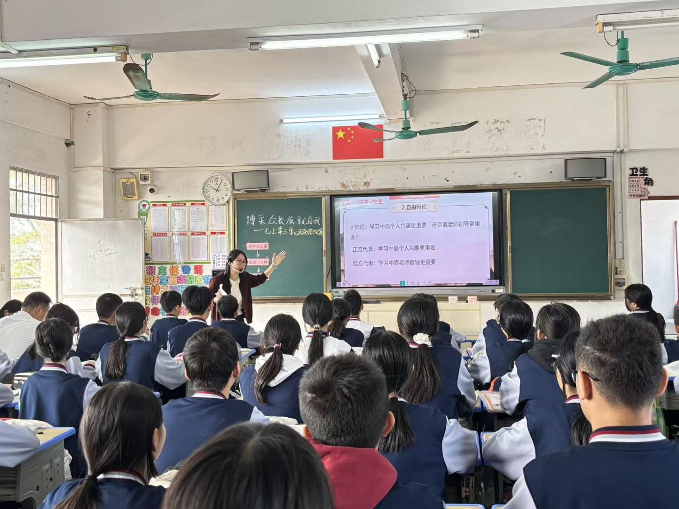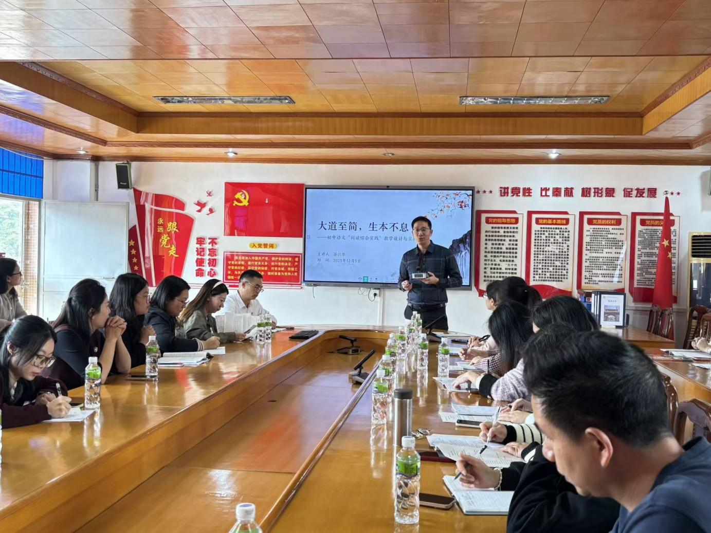 活动聚焦课堂主阵地,各学科送教环节亮点纷呈。语文科组率先开展“同课异构”实践,斗门区博雅中学钟小芳老师与恩城初级中学钟洁莹老师围绕《七年级第三单元阅读综合实践》授课。钟小芳老师以生活化情境任务为抓手,引导学生贯通阅读方法与生活实践;钟洁莹老师采用“小组合作探究 + 成果展示”模式,充分激发学生阅读兴趣与表达热情。课后,珠海市斗门区教育研究中心初中语文教研员、广东省“百千万工程”培养对象苏国华老师,以“初中语文‘阅读综合实践’教学设计与实施”为题作专题分享,结合课例深入剖析核心素养落地路径,为语文教师优化教学提供有力指导。
