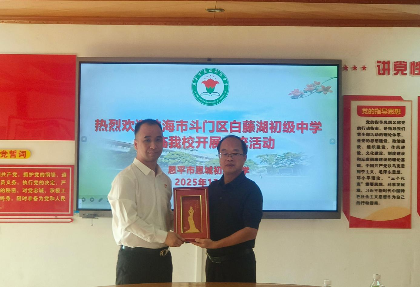 作为活动深化环节,恩城初级中学与白藤湖初级中学举行校际交流座谈会。两校领导、支教团队及跟岗教师代表围绕学校治理、教学创新、教师专业成长及育人文化等议题深入交流,达成持续巩固结对帮扶机制、推动教育资源互补共享的共识。支教与跟岗教师代表分享了交流感悟,纷纷表示在互动中开阔了视野、更新了理念、提升了能力,实现专业与情感的“双向奔赴”。