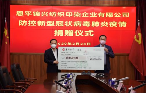 越是艰难时刻,越能体现一个党组织守初心、勇担当。锦兴党支部面对突如其来的疫情,积极发挥战斗堡垒作用,作为一面高举的鲜红旗帜,带领着恩平锦兴印染纺织有限公司在内防疫情稳生产的同时,对外不忘发挥自身社会作用,为抗击疫情不遗余力贡献力量。疫情初期,锦兴公司已向恩平工业园捐赠了口罩等防控物资一批。近日,在锦兴党支部带动下,锦兴公司向恩平产业转移工业园管委会捐赠20万元人民币,用于支持防控新型冠状病毒肺炎疫情工作,尽显社会责任担当。