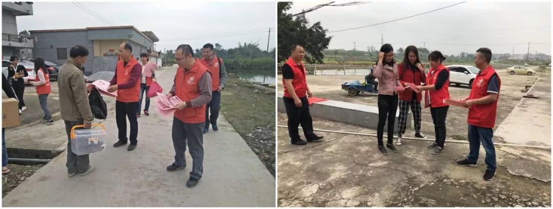 党员义工派发宣传单张并张贴《村规民约》