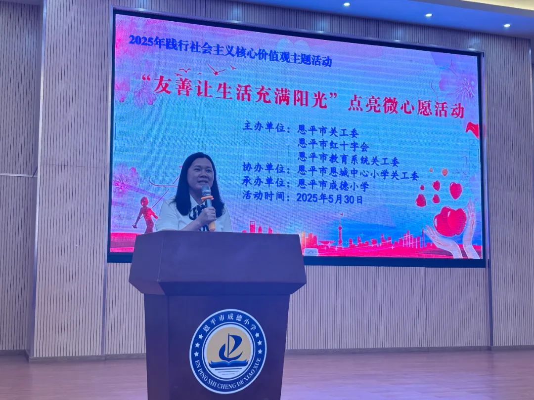 活动伊始,成德小学党支部书记、校长梁柳燕向关心支持学校发展的各级领导、爱心企业表示衷心感谢,并指出,友善是中华民族的传统美德,也是社会主义核心价值观的重要内涵。此次活动旨在通过点亮微心愿、文艺展演等形式,让友善的种子在孩子们心中生根发芽。