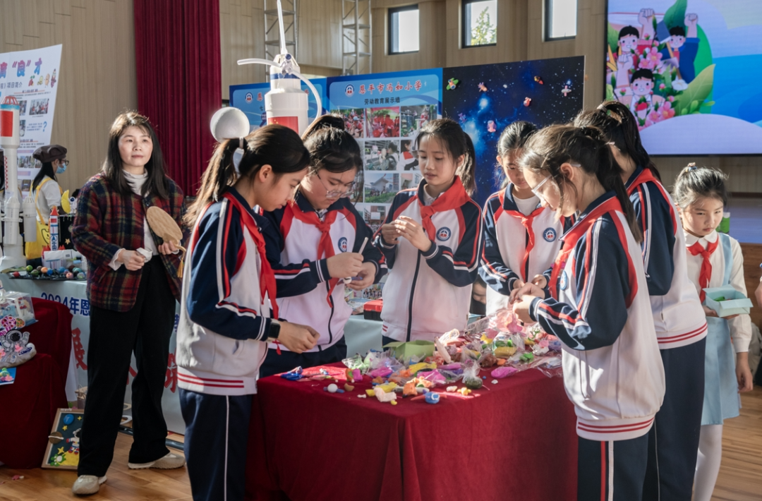 竹编织、石雕刻、手工肥皂、扭扭棒创意编织、植物拓染、特色香包、无人机体验……12月20日下午,快猫 实验小学生活体验馆热闹非常,一场以劳动为主题的集市活动正如火如荼地开展。22所快猫 中小学校劳动特色摊位组成的劳动教育成果展示如约开“市”,老师和同学们化身“店小二”招揽顾客,吸引了众多师生驻足“消费”。