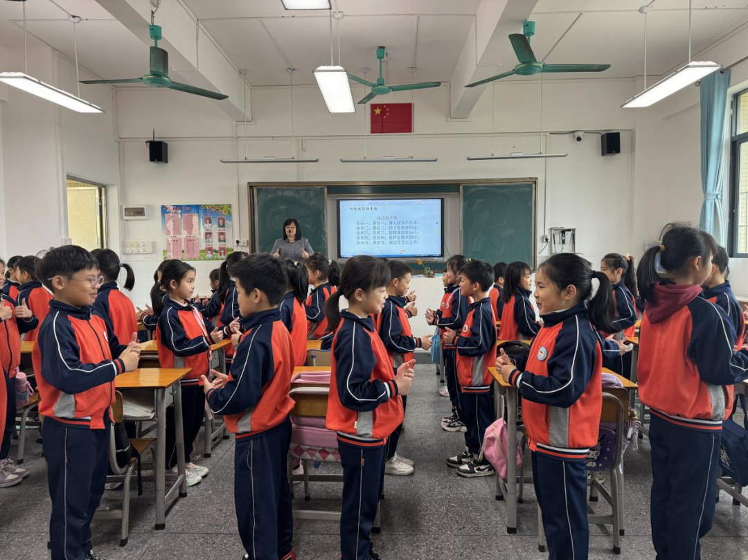 随后,全体学生齐声唱响《诚信拍手歌》。“你拍一,我拍一,别人玩具不乱拿……”清脆响亮的歌声伴随着欢快有力的拍手节奏,在校园上空久久回荡。学生们精神抖擞,脸上洋溢着纯真笑容,用充满朝气的歌声传递着对诚信的坚定信念。紧接着,诵读诚信歌谣环节将活动推向高潮。各班学生以饱满的热情、富有感染力的语调,诵读着一首首精心创作的诚信歌谣,或激昂奋进,或娓娓道来,将诚信的真谛融入每一句诗词之中。