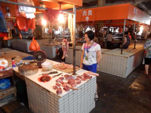 市食品药监局执法人员对市场内猪肉经营户进行现场检查