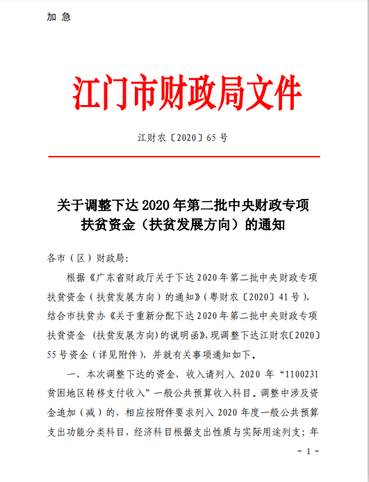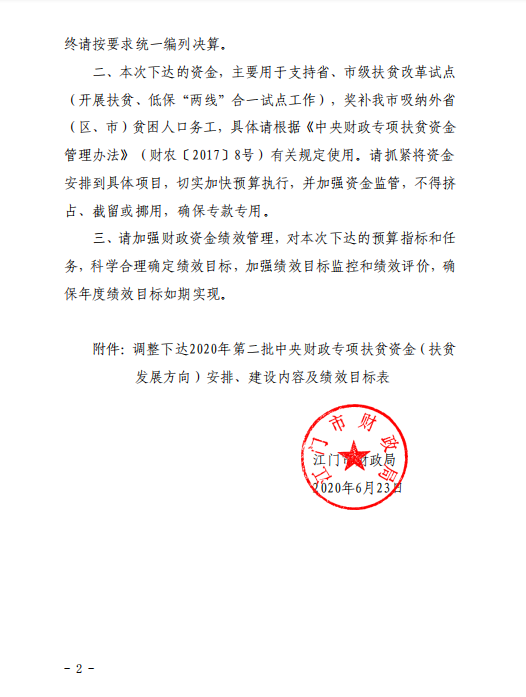 关于调整下达2020年第二批中央财政专项扶贫资金(扶贫发展方向)的通知