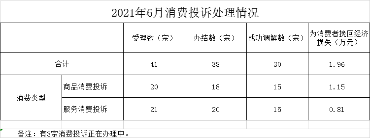2021年6月消费投诉处理情况