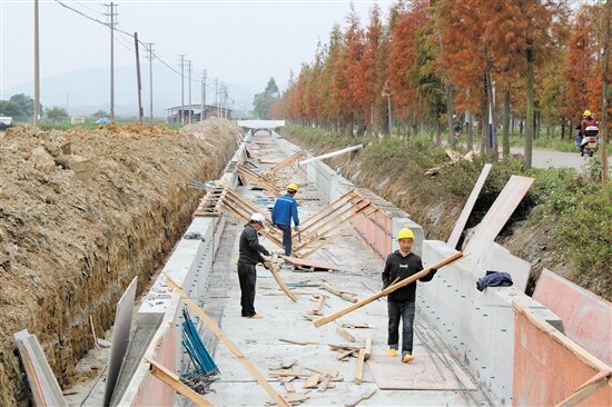 在牛江镇马龙塘村,西坑水库灌溉渠经过之处,大量工人正在开工,扎钢筋、钉模板、批水泥,一幅热火朝天干到底的图景,以炽热的激情击退冬季的寒意。在工人们的共同努力下,一条宽达3.5米、高达1.1米的水渠即将建成,成为万亩农田的“血管”,不久的将来,来自西坑水库的灌溉水源将充满水渠,为沙湖、牛江、良西等农业重镇送来源源不断的活水。“对水渠进行‘三面不见土’改造,将大幅提升水资源使用率,灌溉渠的水源不再渗漏到泥土中,输水效率也得到大幅度提升。”快猫 水利局工作人员表示。