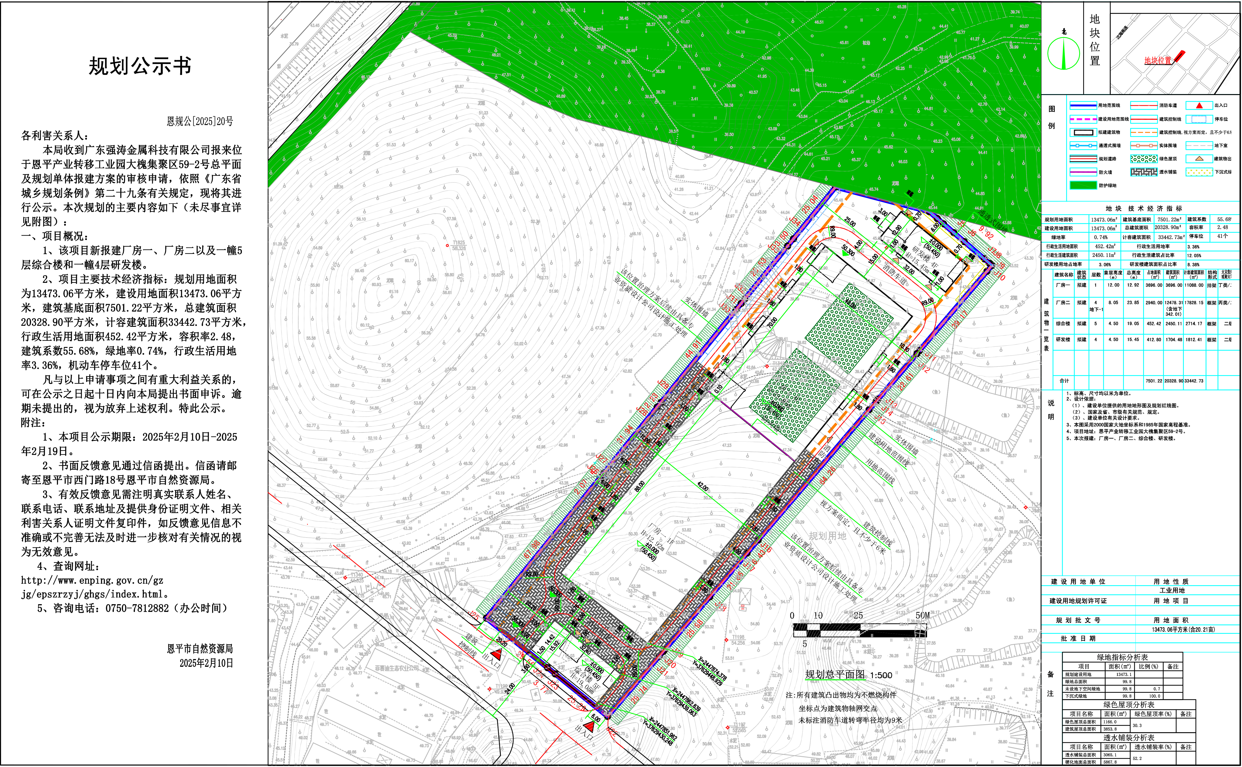 本局收到广东强涛金属科技有限公司报来位于恩平产业转移工业园大槐集聚区59-2号总平面及规划单体报建方案的审核申请,依照《广东省城乡规划条例》第二十九条有关规定,现将其进行公示。本次规划的主要内容如下(未尽事宜详见附图):