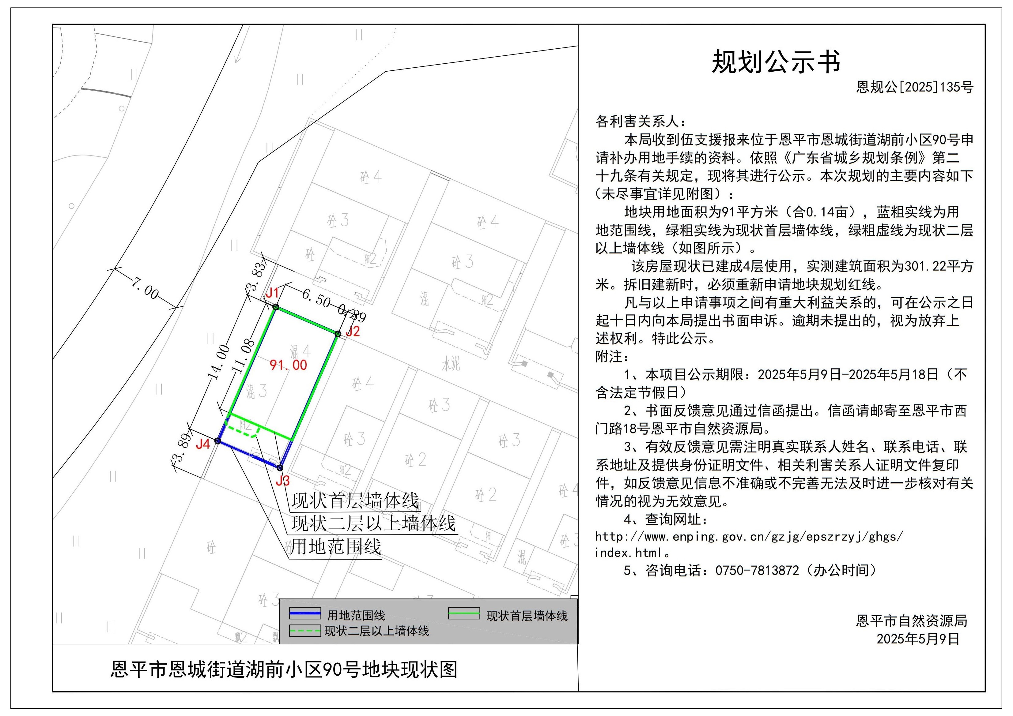 恩规公[2025]135号 规划公示书 关于快猫 恩城街道湖前小区90号(伍支援)的地块现状图公示