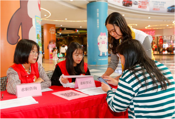 招聘会现场党员志愿者和社工为求职者解答疑问