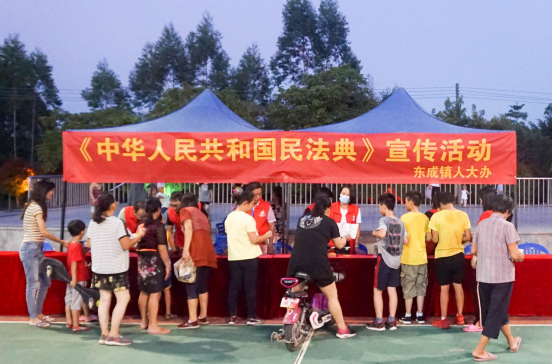 三、丰富形式全民学。东成镇、恩平工业园在各层面广泛精心组织开展民法典学习宣传活动,力求民法典深入人心、落地生根。例如东成人大将民法典学习宣传作为人大主题活动月的“重头戏”,采取多种形式广泛开展宣传。7月15日,东成镇人大举办民法典专题学习会,逾60名人大代表参加学习,会议还发放宣传民法典倡议书,并现场举行了现场测试,巩固学习成效。7月23日傍晚,东成人大联合东成司法所在东成文化广场举办民法典专题宣传,活动通过派发宣传小册子、广播民法典知识、现场解答群众提问等方式开展。接地气的宣传方式吸引了众多群众参与,现场共派发了宣传小册子500多份,为40多名群众解答问题,活动现场热闹非凡。群众纷纷表示,民法典学习送到家门口,是很好的学习的机会,也丰富了自己的法律知识。