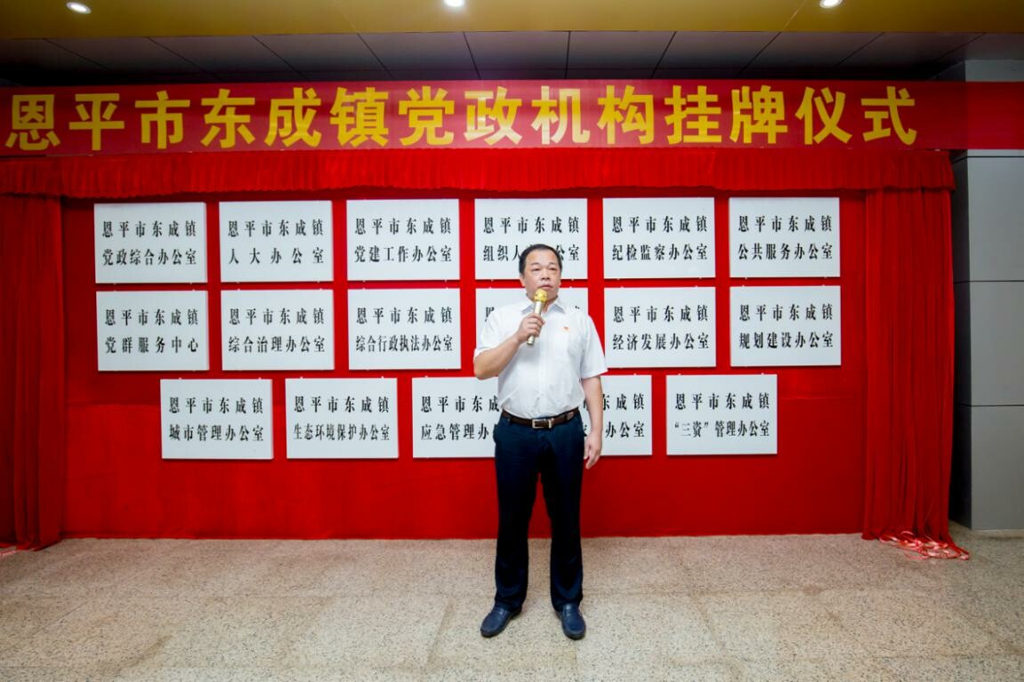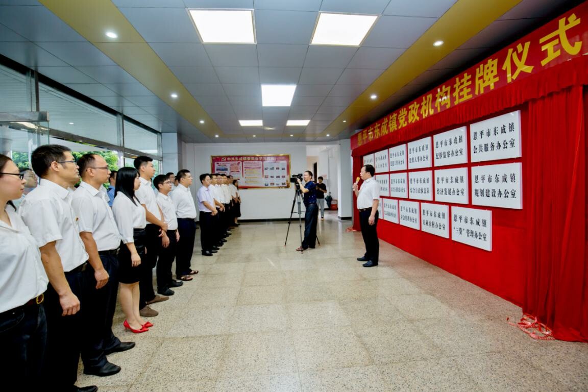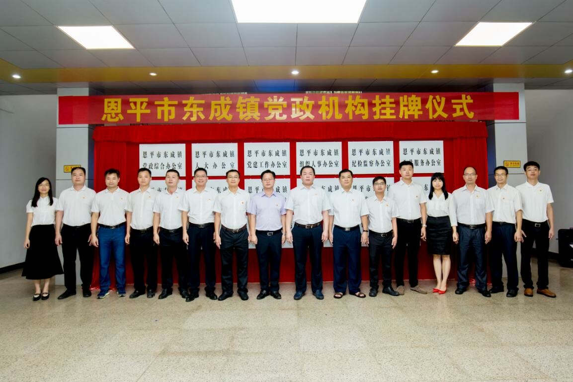 8月13日上午,东成镇举行党政机构挂牌仪式。副市长,工业园党工委书记、管委会主任,镇委书记岑安林出席仪式并作讲话。东成镇、恩平工业园领导班子成员,东成镇全体干部,市直派驻机构负责人共50多人参加了仪式。