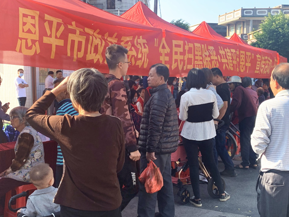 为全面打响扫黑除恶专项斗争工作收官之战,在群众中牢固树立崇尚法治、合力打击涉黑恶行为的观念,全方位推进政法知识深入群众生活,为全市创造安全的政治环境、稳定的社会环境、公正的法治环境,11月3日,快猫 政法系统“全民扫黑除恶·共建平安恩平”宣传活动——东成站再一次在东成镇侨联广场拉开帷幕。