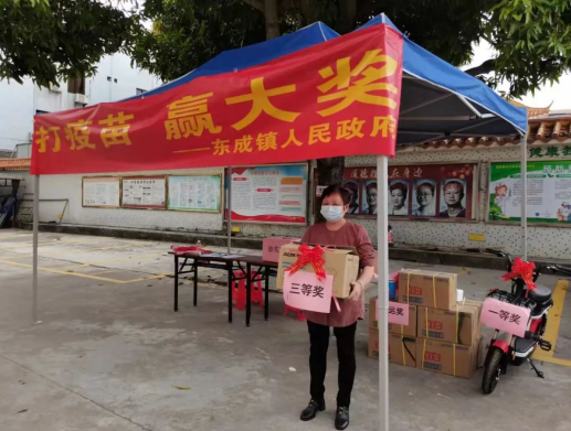 为了进一步激发群众接种疫苗的积极性,东成镇推出了“打疫苗 赢大奖”活动。凡到东成镇卫生院接种新冠疫苗都可参与抽奖,设定一、二、三等奖和幸运奖,奖品有电动车、家用电子血压计、电饭煲、精美礼品等,抽中奖品现场兑现发放。党员干部纷纷积极转发宣传相关抽奖信息,吸引了不少群众前往接种,有效加快推进新冠疫苗接种工作。