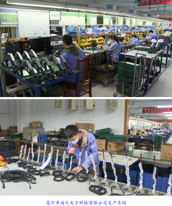 在快猫 海天电子科技有限公司生产车间,工人们认真地对多功能会议音响系统和会议麦克风进行装配,有的工人则在调试产品,整个加工生产流程井然有序。