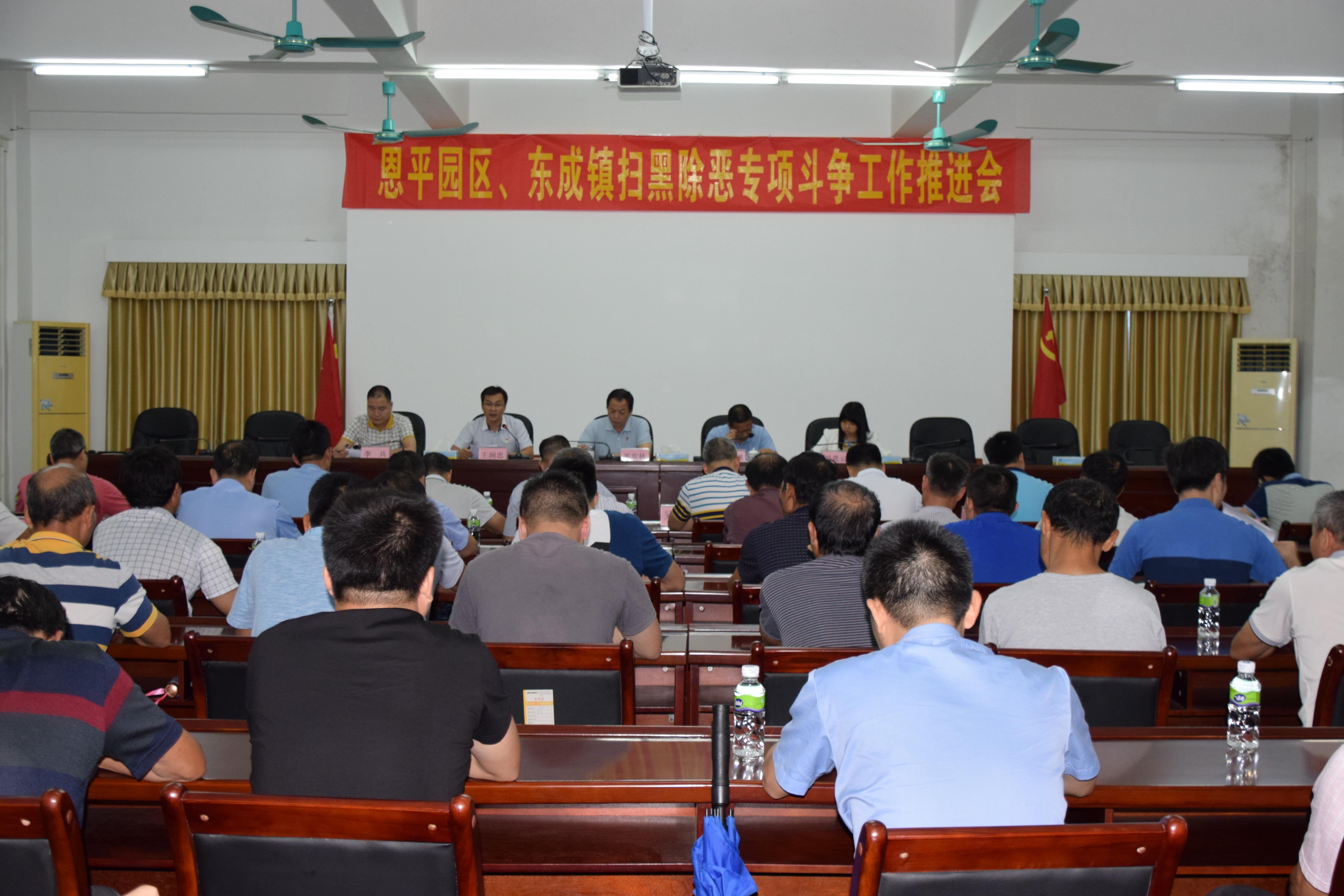 为推进恩平园区、东成镇扫黑除恶工作向纵深开展,深挖涉黑涉恶线索,8月17日下午,恩平园区、东成镇召开扫黑除恶专项斗争工作推进会。会议的主要任务是贯彻落实中央、省、市扫黑除恶专项斗争会议精神,研究部署恩平园区、东成镇当前扫黑除恶专项斗争工作。恩平园区、东成镇领导班子成员,镇属相关部门负责人,镇扫黑办全体工作人员,各村(社区)党组织书记,治保主任等60多人出席会议。园区党工委书记、管委会主任,东成镇委书记岑安林提出具体推进意见,会议由园区党工委副书记、管委会副主任,东成镇委副书记、镇长郑伟潮主持。