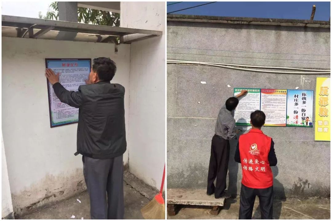 党员义工派发宣传单张并张贴《村规民约》