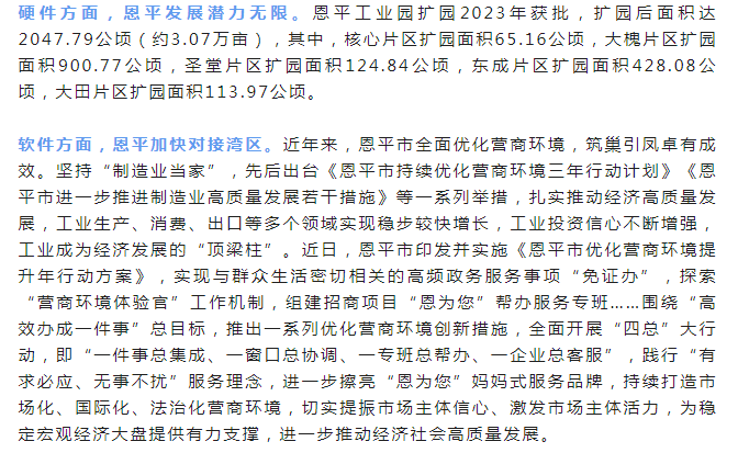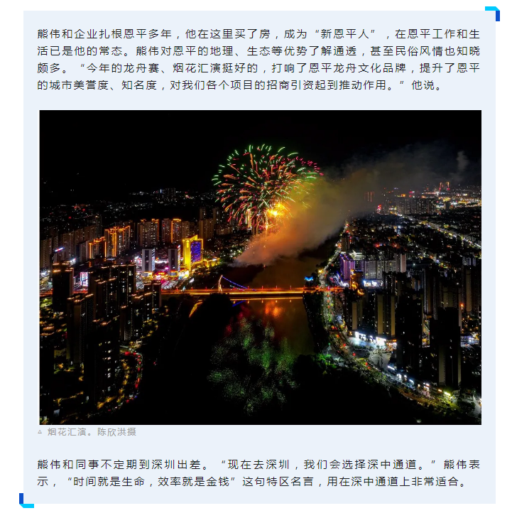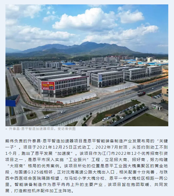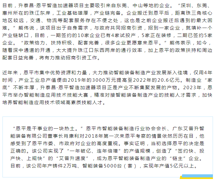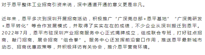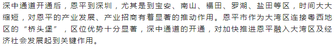 “深中通道的通车,将大大提升珠江口东西两岸的通行效率,恩平可以进一步吸引深圳客商,对恩平加快