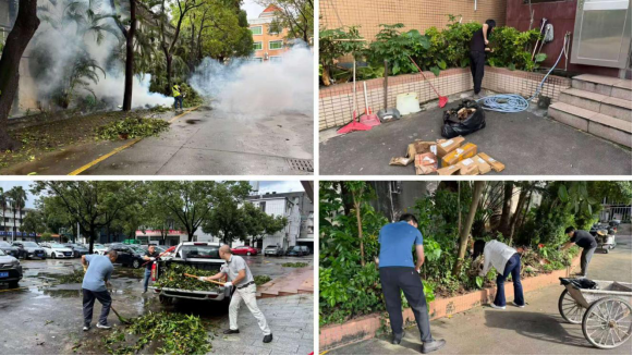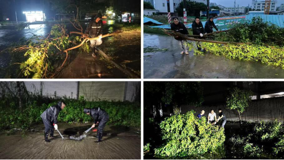 台风登陆期间,园区党员干部始终坚守岗位,领导班子带领党员干部到园区辖区内主要道路进行清障及疏通堵塞的排水口。当发现树木被狂风刮倒,园区党员突击队冒雨奋战3小时扶起树木,清理树枝等路面障碍物,清理排水渠(雨水口),确保路面通畅、雨水排放;台风过后,党员干部又迅速转入灾后清理与消杀复盘,对积水消退区域开展补杀作业,确保灾后无蚊媒传染病发生。