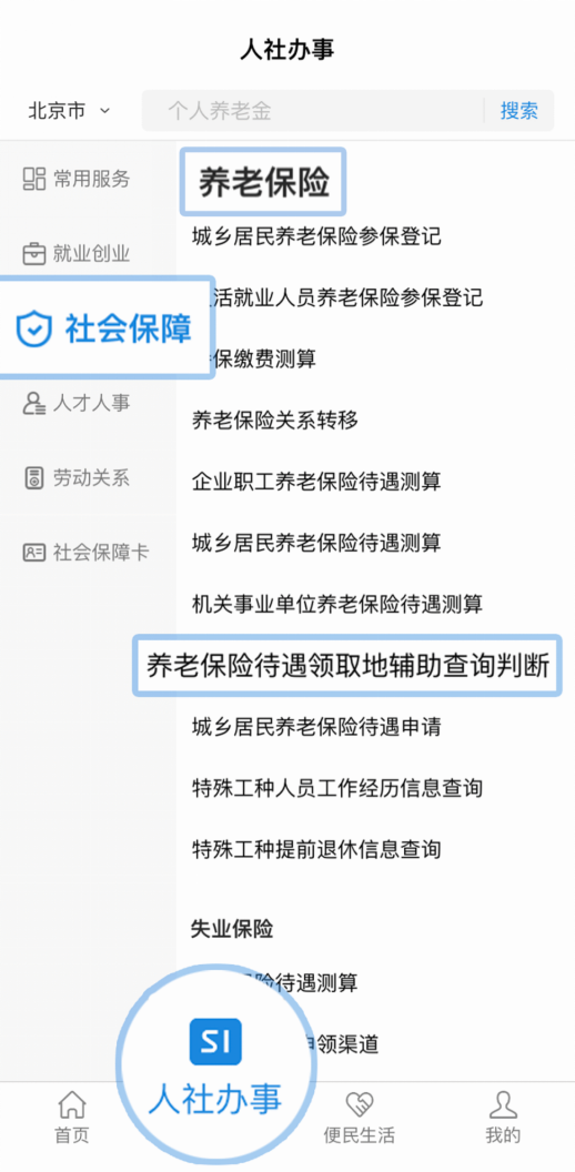 登录电子社保卡,在【人社办事】-【社会保障】-【养老保险】,点击【养老保险待遇领取地辅助查询判断】。