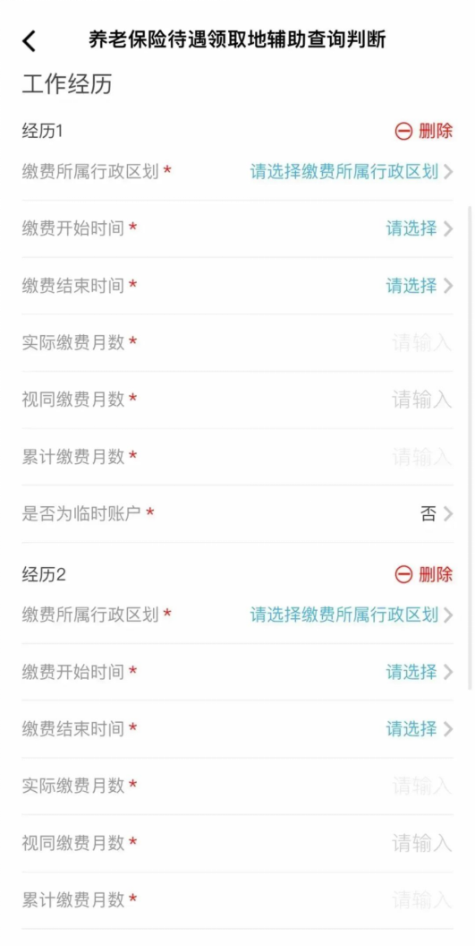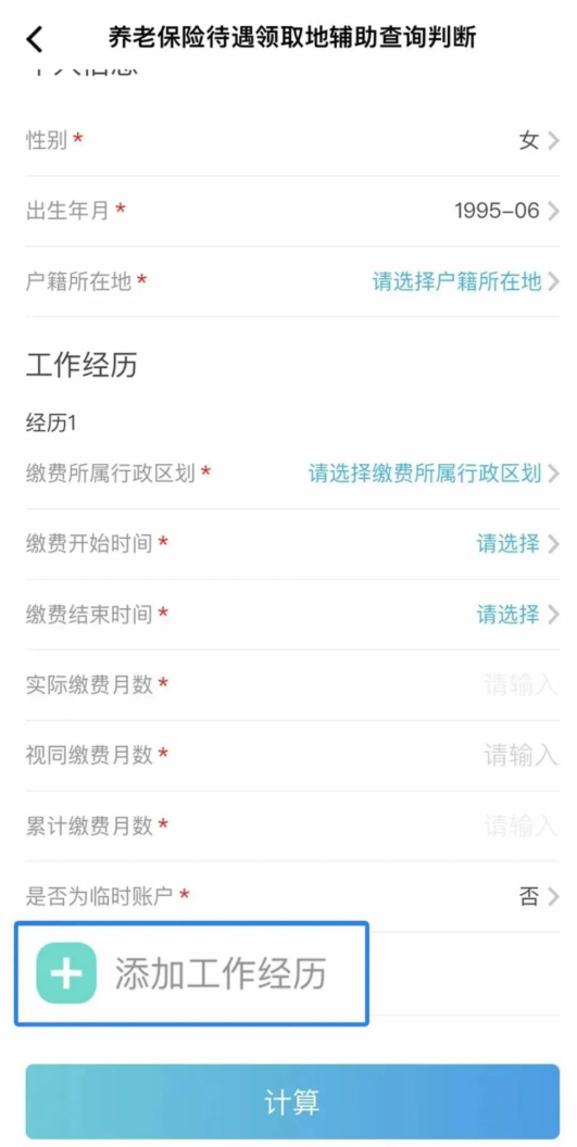 填写相关信息,若您有多段工作经历,可选择【添加工作经历】,点击【计算】开始查询。