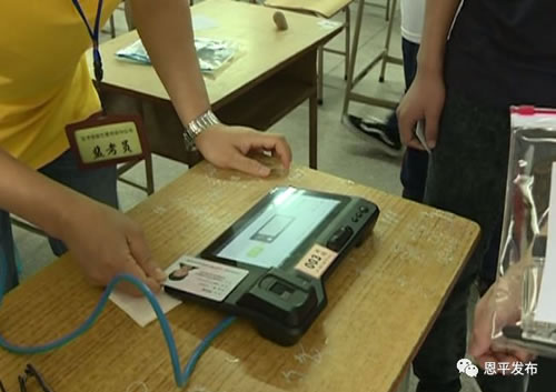 八点半,考生陆续进入考场。按照规定,每个考生在进入考场前,都需要接受金属探测仪的检查,并在监考老师的指导下,拿出身份证,在考点设置的身份识别仪上进行身份以及指纹等多重验证。工作人员还提醒考生不能携带各种无线通讯工具以及任何带有文字标签的饮用水、水杯等物品进入考场。