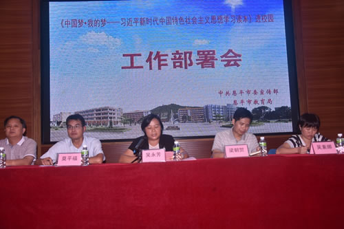 为全面铺开《中国梦·我的梦——习近平新时代中国特色社会主义思想学习读本》(简称《学习读本》)进校园工作,9月25日,市委宣传部、市教育局联合在恩平一中,举行《学习读本》进校园工作部署会。市委常委、宣传部长吴永芳,市《学习读本》进校园工作领导小组成员,全市中小学校校长、政教主任、政治课教师以及恩平一中师生代表等380多人参加会议。