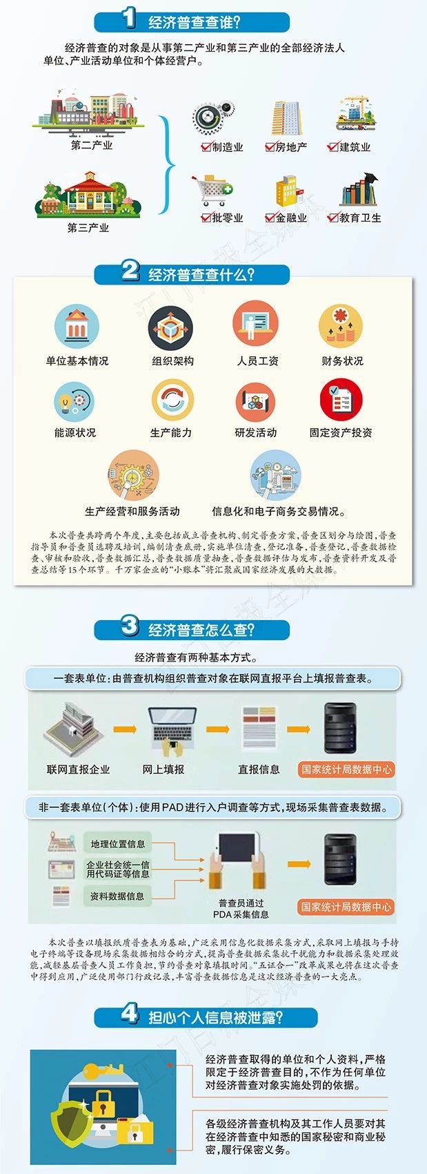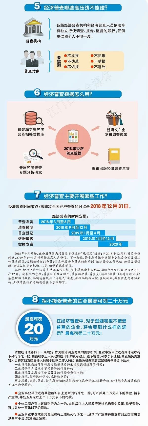 与此同时,经济普查取得的资料不作为任何处罚的依据,拒不接受普查的企业最高可罚二十万元。对于经济普查,你还有哪些疑惑?下面几张图让你全方位了解。