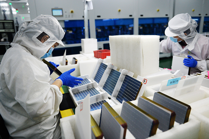 2023年6月17日,在阳光中科(福建)能源股份有限公司,工人在高效太阳能电池车间工作。该公司位于福建泉州南安市,是国家级绿色工厂企业,无尘自动化生产线日产太阳能电池80万片。新华社记者 刘勇贞 摄
