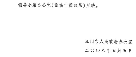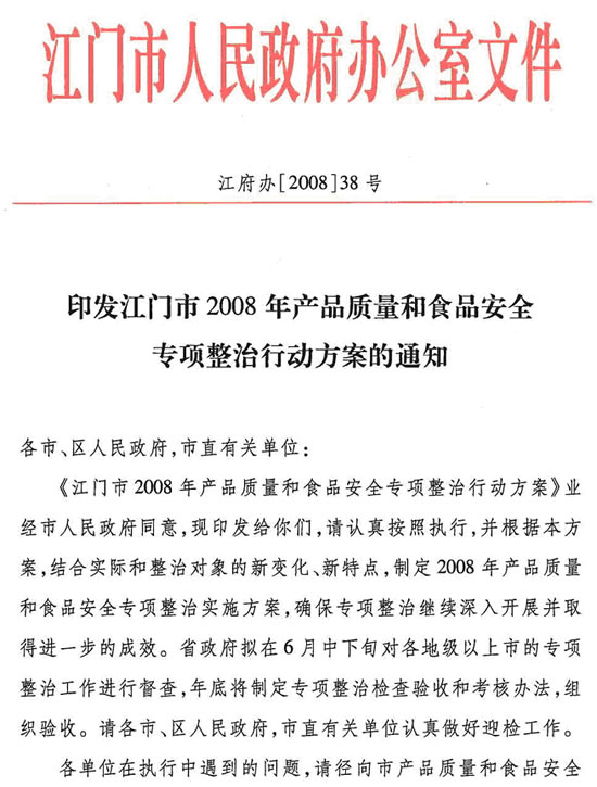 经市人民政府同意,现将江门市政府办公室《印发江门市2008年产品质量和食品安全专项整治行动方案的通知》(江府办〔2008〕38号)转发给你们,请认真按照执行。并请市产品质量和食品安全工作领导小组办公室(设在市质监局)结合本市实际,尽快制订我市2008年产品质量和食品安全专项整治行动方案报市政府。