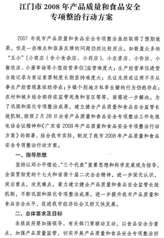 转发江门市2008年产品质量和食品安全专项整治行动方案的通知