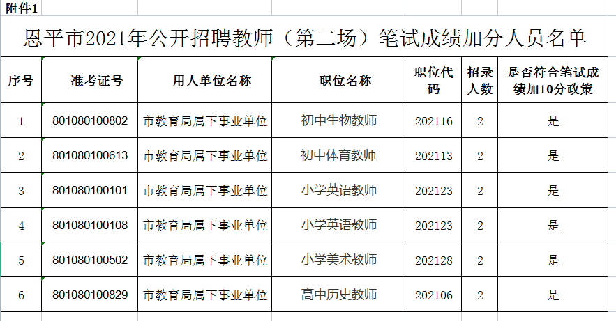 2021年公开招聘教师(第二场)笔试前资格审核中,我局对考生提交的笔试加分材料进行了审核。经审核,共有6人符合“笔试加分”政策。现对审核通过人员名单予以公示,公示时间从2021年7月30日至2021年8月3日止。