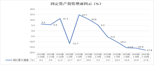 二、固定资产投资。1—10月,全市固定资产投资同比下降17.8%。其中,第一产业投资增长133.5%;第二产业投资下降28.8%;第三产业投资增长0.3%。