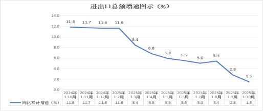 四、外贸进出口。1—10月,实现外贸进出口总值38.7亿元,同比增长1.5%。其中,出口33.6亿元,同比增长2.5%;进口5.1亿元,同比下降4.8%。