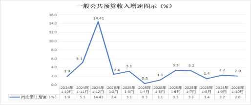 五、财政收支。1—10月,全市一般公共预算收入累计完成14.52亿元,同比增长2.0%;全市一般公共预算支出31.25亿元,同比下降4.3%。