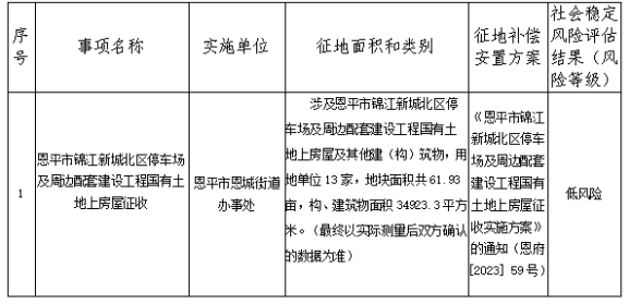 按照《中华人民共和国政府信息公开条例》规定程序,快猫 恩城街道办事处拟对快猫 锦江新城北区停车场及周边配套建设工程国有土地上房屋征收社会稳定风险评估结果公示,公众可以以信函、传真、电子邮件等方式提交书面意见。