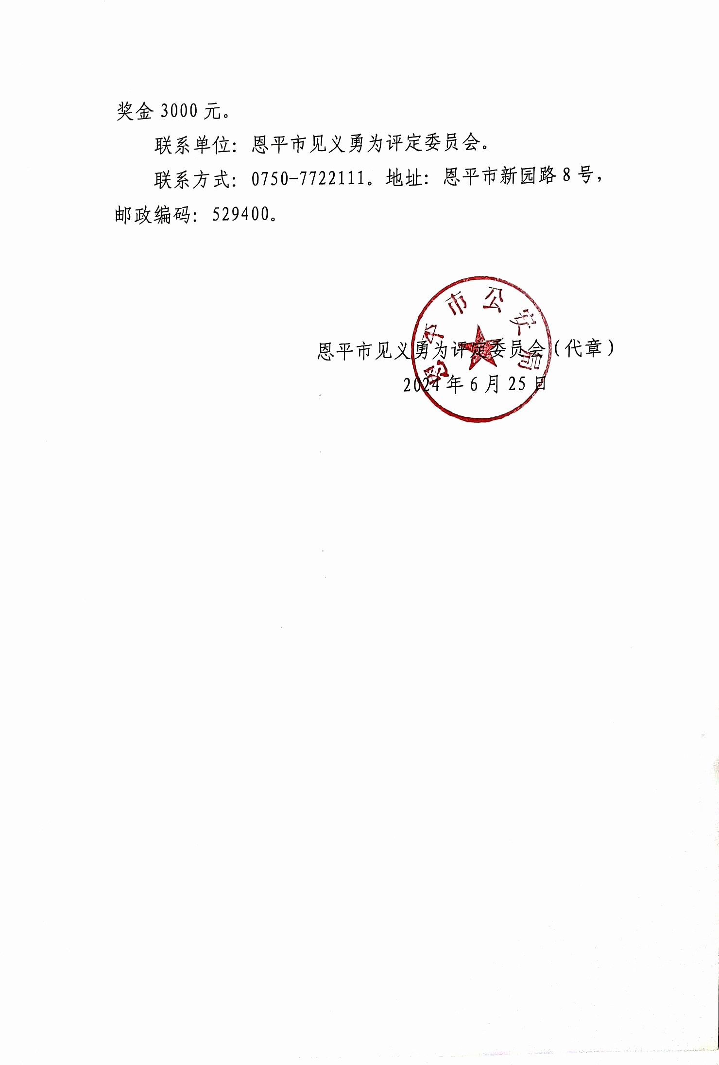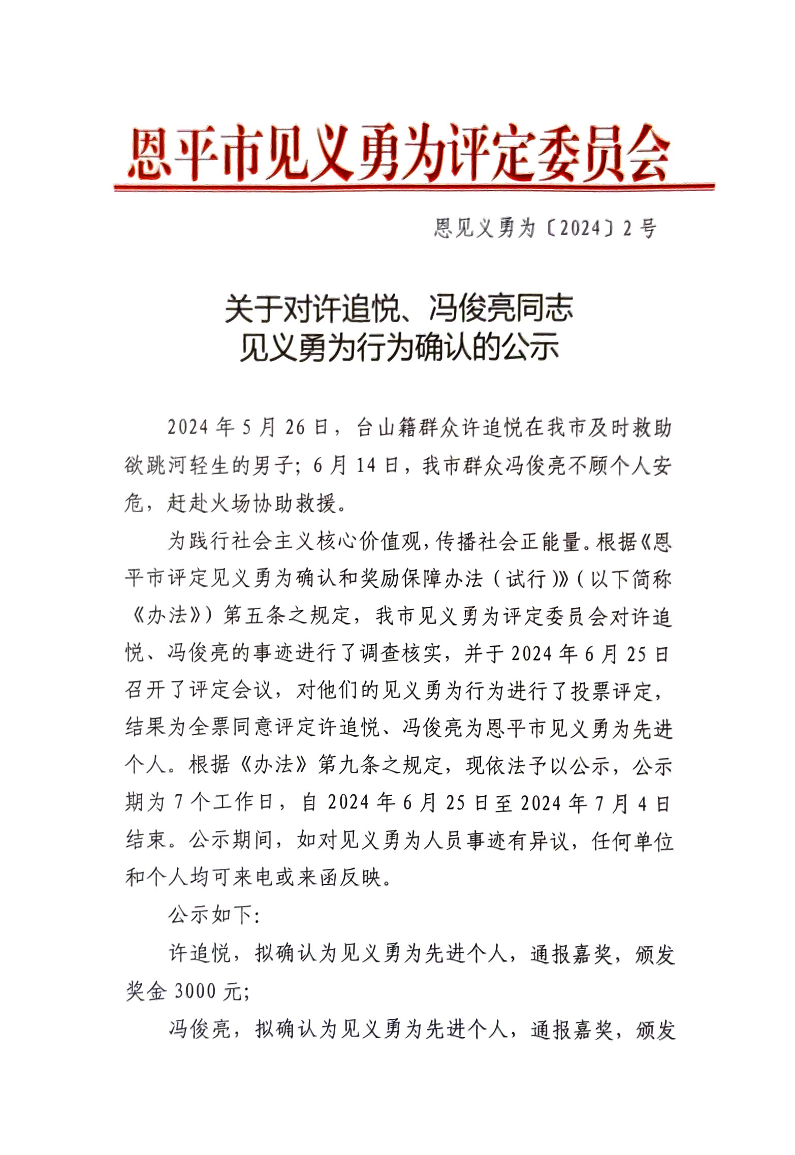 见义勇为先进个人。根据《办法》第九条之规定,现依法予以公示,公示期为7个工作日,自2024年6月25日至2024年7月4日结束。公示期间,如对见义勇为人员事迹有异议,任何单位和个人均可来电或来函反映。