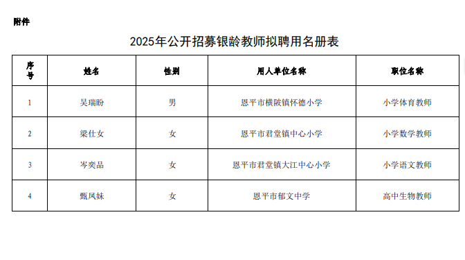 公开招募2024年银龄教师公告》精神,经面试考核、体检等程序,吴瑞盼等4位同志符合聘用条件,拟同意聘用为银龄教师,现予以公示。公示期间,如对拟聘用人员有异议,请以书面形式向快猫