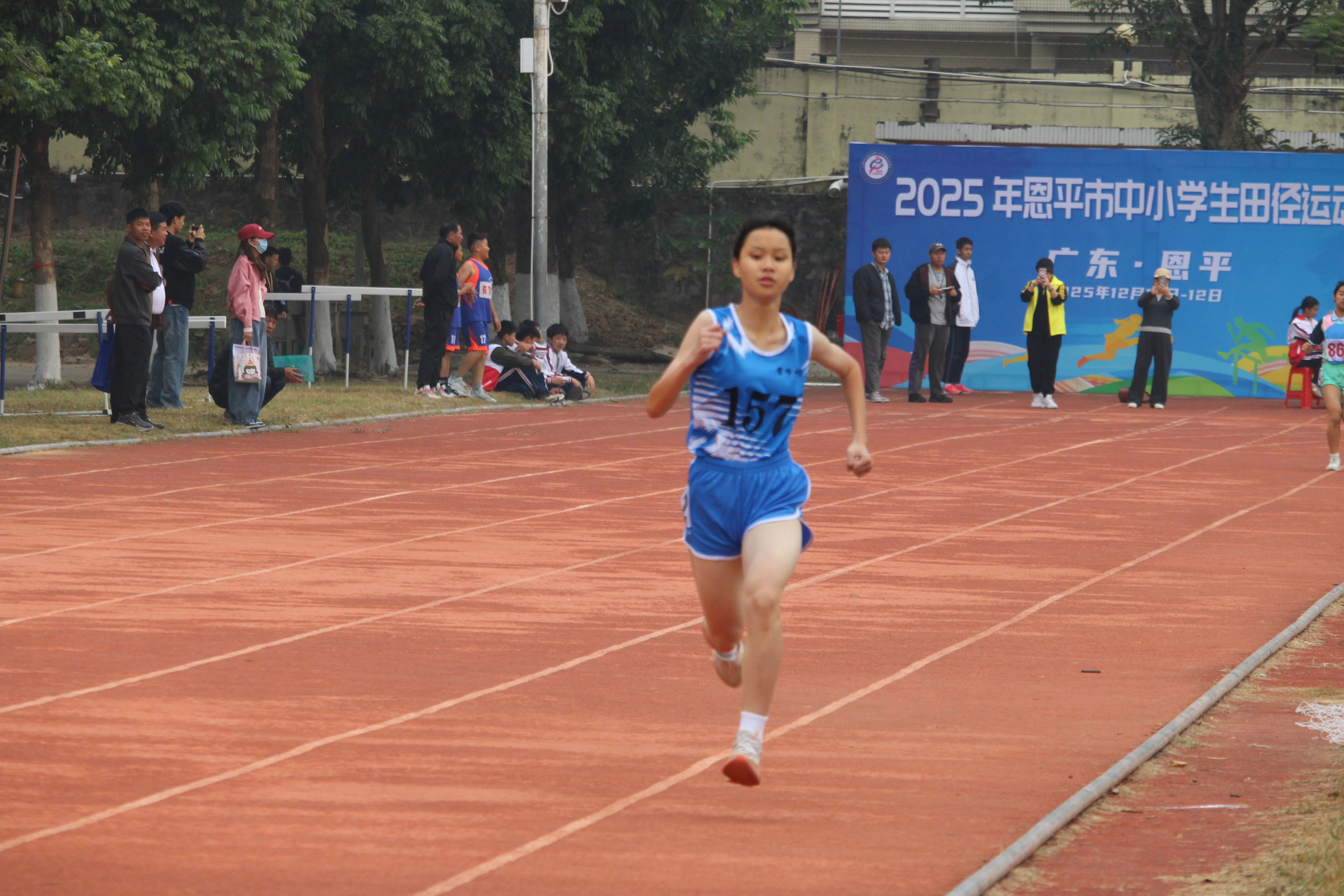 开幕式后,比赛正式拉开帷幕,男子初中组、女子初中组、男子高中组和女子高中组的800米决赛率先鸣枪开跑。在备受关注的男子高中组800米赛事中,恩平一中学生袁昊文以绝对优势摘得桂冠。冲刺阶段,遥遥领先的他还向观众席送上“胜利之吻”,最终以2分04秒18的成绩冲过终点线。本次赛事,袁昊文报名了800米和400米两个个人项目,他的后续表现值得期待。“这次比赛我还没尽全力,不过也积累了不少实战经验。”袁昊文赛后坦言,“我的偶像是刘德助,希望能朝着他的方向努力,未来走体育专业道路,通过体育特长考上理想的大学。”他分享道,自己的训练主要利用课余时间,通过看书、看视频钻研技术动作,在一次次打磨中逐步提升成绩。今年,袁昊文曾在2025年广东省中学生田径锦标赛中崭露头角,以51秒96的成绩斩获男子甲组400米亚军,目前已成功考取男子400米和800米两个项目的国家二级运动员证书。接下来,他还将代表恩平出征江门市的相关赛事。