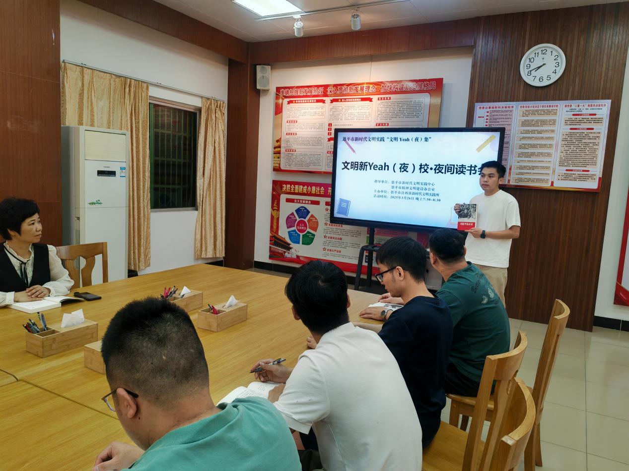 “文明Yeah(夜)集”立足群众需求,创新采用多样化活动载体,让乡村夜晚焕发独特文化魅力。以“文明新Yeah(夜)校”夜间读书会为阵地,围绕领袖故事、法律典籍、家风读物等主题,通过经典共读与互动交流,将社会主义核心价值观融入日常生活,引导村民与青少年在书香中涵养美德、提升素养;以“惠民Yeah(夜)演出”为平台,由镇音乐曲艺社担纲,上演《花好月圆》等经典粤曲,让群众在婉转唱腔中感受非遗文化魅力,推动曲艺传承与破圈传播;以“快乐Yeah(夜)分享”露天电影为纽带,结合交通安全公益宣传片播放,既强化群众安全意识,又通过光影共享凝聚邻里温情。活动形式相互补充,从知识传播到文化传承再到公益宣教,形成了全方位的夜间文化供给体系。