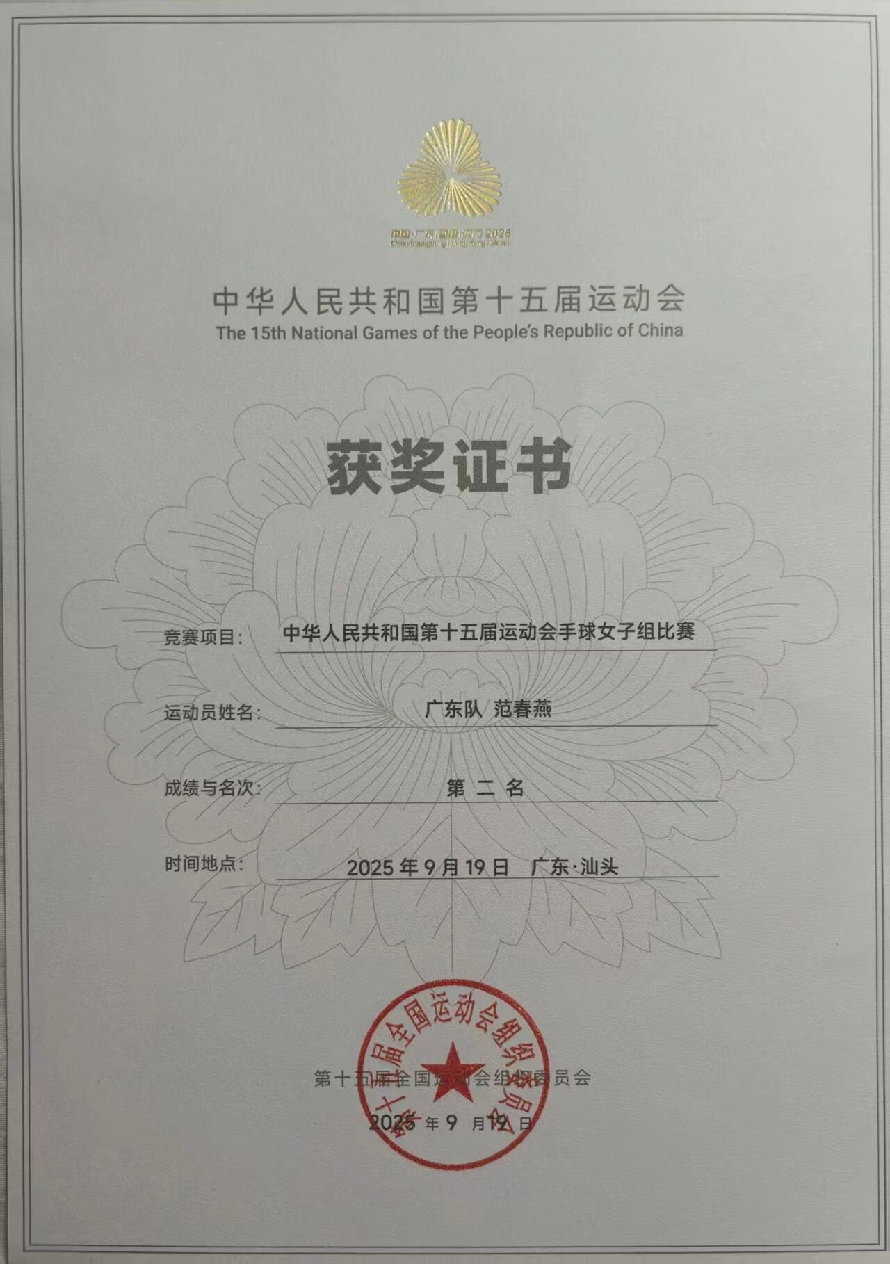 体育学校的国家级运动健将范春燕,作为广东女子手球队成员征战第十五届全运会,助力队伍夺得女子手球项目亚军,刷新了广东女手全运会历史最佳战绩。