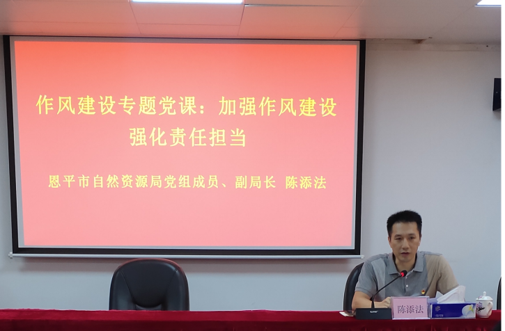 为进一步加强党员干部作风建设,打造高素质干部队伍,7月28日,市自然资源局开展作风建设专题学习会,由局党组成员、副局长陈添法讲授主题为《加强作风建设 强化责任担当》的党课。