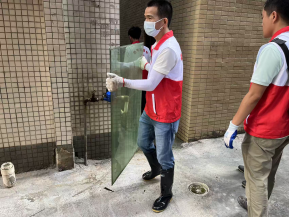 “轻伤不下火线”的担当——在搬运一块沉重废弃的钢化玻璃门时,“小辉”同志不慎被锋利的玻璃边缘划伤手臂,在进行了简单的消毒包扎后,他婉拒了大家让他休息的建议,笑着说“小口子,不碍事”,随即又投入到紧张的清理工作中。“小德”同志在协力推运一辆沉重的闲置烧烤车时,车轮打滑不慎压伤了脚,他忍着“十指归心”痛缓了片刻,便跛着脚继续投入清运工作。“小龙”同志在一条狭窄的冷巷中弯腰清理砖块,1.78米的高个碰上了1.5米高的排气口钢罩,头顶的浓发也抵不住“钢的亲吻”,当场被划出了一道口子,简单用纸巾堵了堵便又继续开始“搬砖”。面对这些突如其来的“挂彩”,他们没有一句怨言,均以顽强的意志力选择继续坚守岗位。