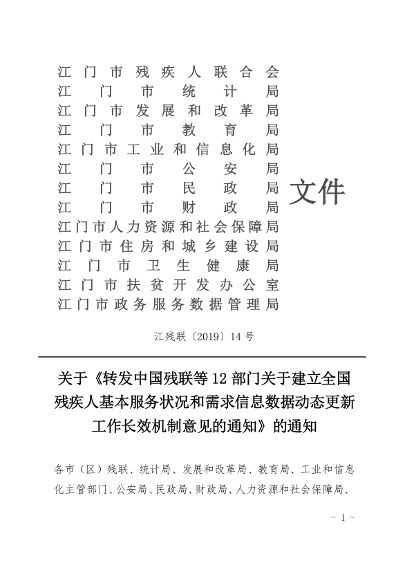 (失效)江残联[2019]14号_关于《转发中国残联等12部门关于建立全国残疾人基本服务状况和需求信息数据动态更新工作长效机制意见的通知》的通知