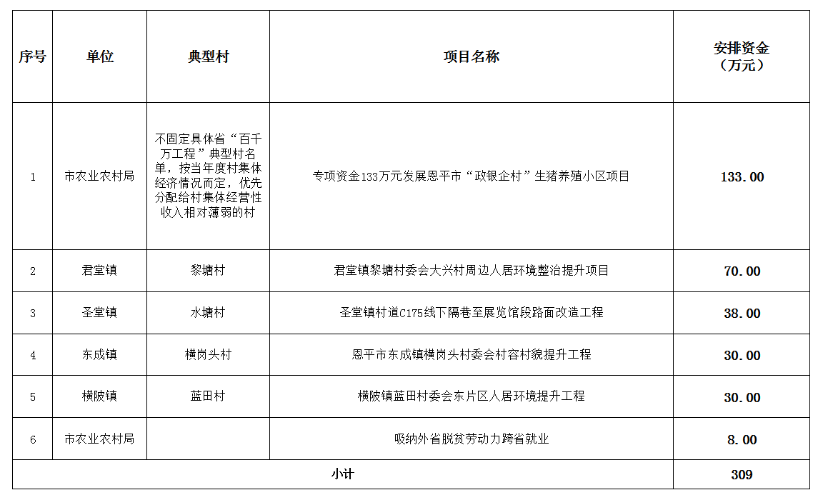 江门市财政局《关于下达2024年中央财政衔接推进乡村振兴补助资金(巩固拓展脱贫攻坚成果和乡村振兴任务)的通知》(江财农〔2024〕4号),下达我市2024年中央财政衔接推进乡村振兴补助资金共309万元。
