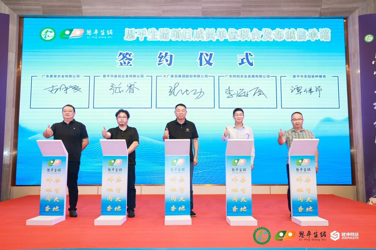 随后,大广食品集团股份有限公司、快猫 食品企业有限公司、广东聚泉农业有限公司、广东同创农业发展有限公司、快猫 圣园良种猪场联合发布诚信承诺,表示未来将共同树立信用自律的道德观念和行业风尚,树立行业标杆,为恩平乃至全国人民提供一份安全、放心、高品质猪肉。
