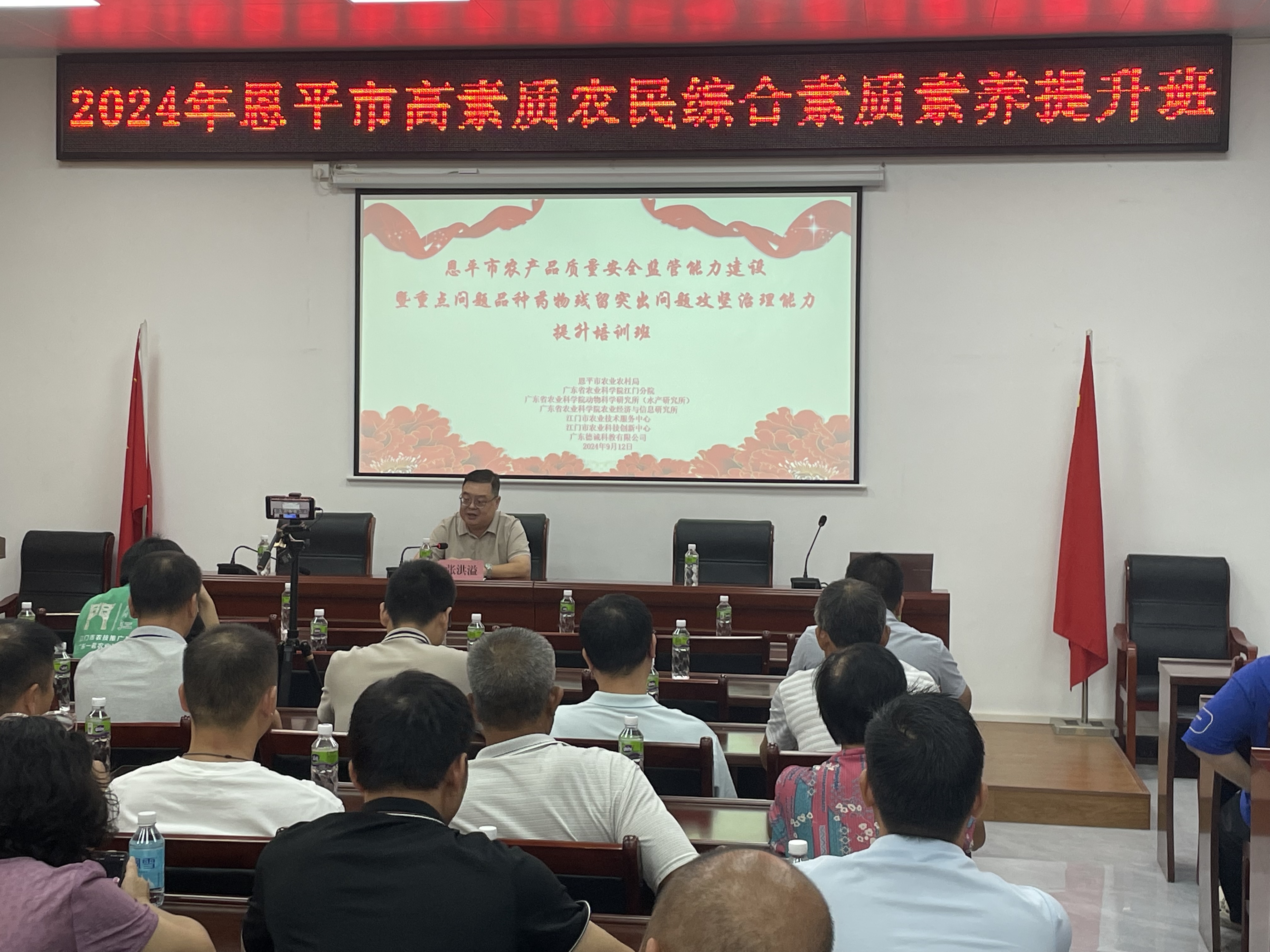 农产品质量安全监管能力建设暨重点问题品种药物残留突出问题攻坚治理能力提升培训班在恩城街道办米仓村委会、沙湖镇东岸村委会顺利开班,本培训班邀请了省农科院研究员彭凯同志及南海水产研究所研究员刘广锋同志前来授课,主要就乌鳢、大口黑鲈等水产重点监管品种绿色养殖技术进行了指导,帮助一线农业生产主体及时更新技术储备,规范用药,提高农民综合素质素养。