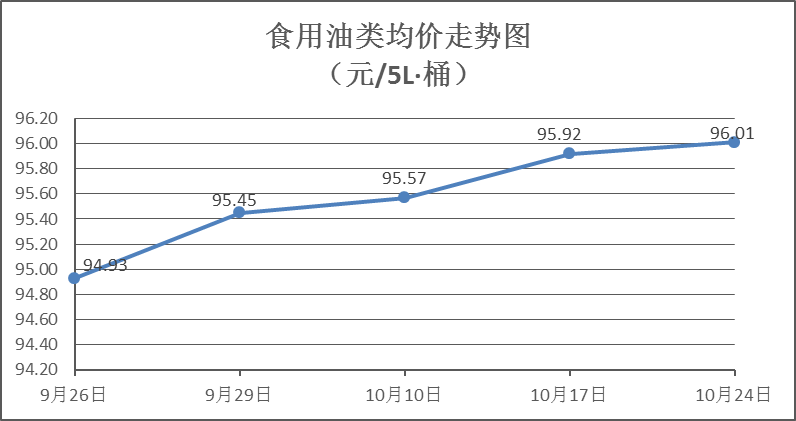 食用油类商品价格稳中微涨。本周所监测的9种食用油(5L装)商品价格波动情况为3涨1跌5平,综合零售均价为96.01元/桶,环比上涨0.10%。其中:金龙鱼花生油、大豆油零售均价分别为每桶106.06元、60.21元,环比分别上涨0.26%、上涨0.35%。