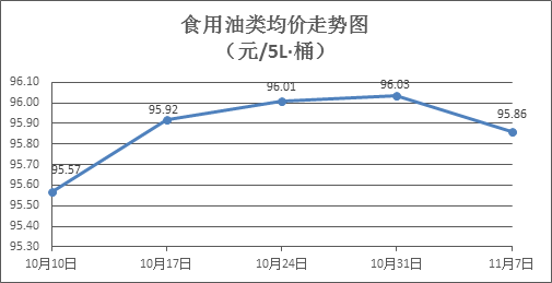 食用油类商品价格稳中略降。本周所监测的9种食用油(5L装)商品价格波动情况为3涨3跌3平,综合零售均价为95.86元/桶,环比下降0.18%。其中:鲁花花生油、玉米油零售均价分别为每桶158.58元、74.11元,环比分别下降1.00%、上涨0.39%。