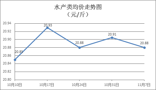 水产类商品价格窄幅盘整。本周所监测的10种水产商品价格波动情况为4涨5跌1平,综合均价为20.88元/斤,环比下降0.13%。其中:草鱼、鳙鱼、罗非鱼、基围虾零售均价分别为每斤11.76元、10.77元、8.61元、37.63元,环比分别上涨1.91%、下降1.73%、下降1.15%、下降1.47%。